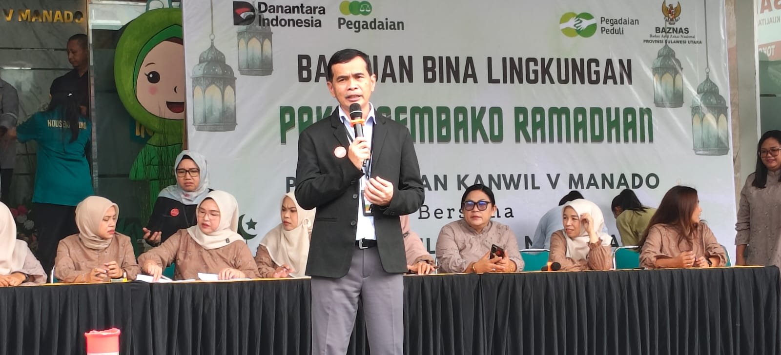 Deputi Operasional PT Pegadaian Kanwil V Manado, Widi Sunardi membuka kegiatan Bantuan Bina Lingkungan Pembagian Sembako Ramadhan. Dalam sambutannya, Widi Sunardi menyampaikan terima kasih kepada warga kota Manado, sudah hadir dalam kegiatan pembagian sembako ramadhan.